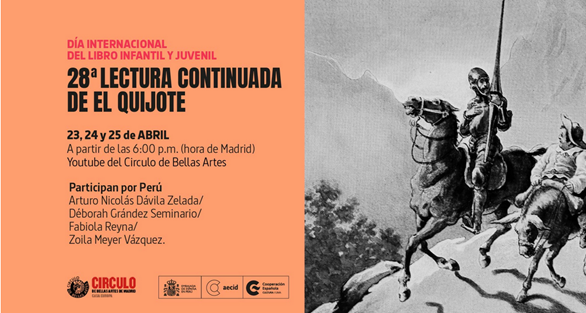 El Círculo de Bellas Artes de Madrid celebra la 28 edición de la tradicional lectura continuada de El Quijote con motivo del Día Internacional del Libro. Desde Perú participarán cuatro destacados agentes culturales en sus respectivas especialidades y espacios: Arturo Nicolás Dávila Zelada, creador audiovisual, dramaturgo y director escénico transmasculino; Déborah Grández Seminario, directora de la Fundación Capaz-Perú; Fabiola Reyna, fundadora del Festival de Cine Hecho por Mujeres; y Zoila Meyer Vázquez, docente y activista comunitaria.