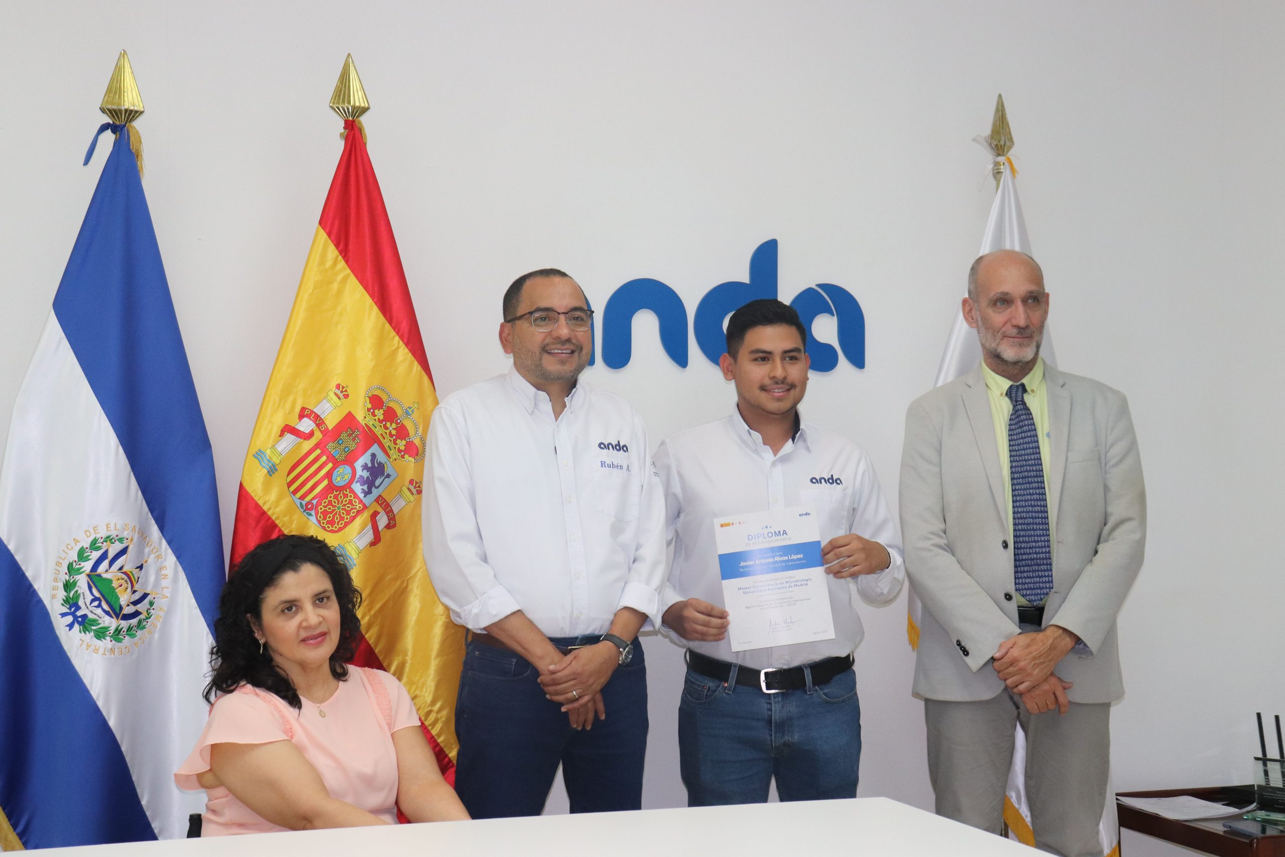Representantes de la Agencia Española de Cooperación Internacional para el Desarrollo (AECID) y de la Administración Nacional de Acueductos y Alcantarillados (ANDA) brindaron reconocimiento a tres funcionarios de ANDA seleccionados para las Becas MAEC en la modalidad «Máster Agua», otorgada a profesionales de la gestión del ciclo urbano del agua para la realización de un máster universitario en España.